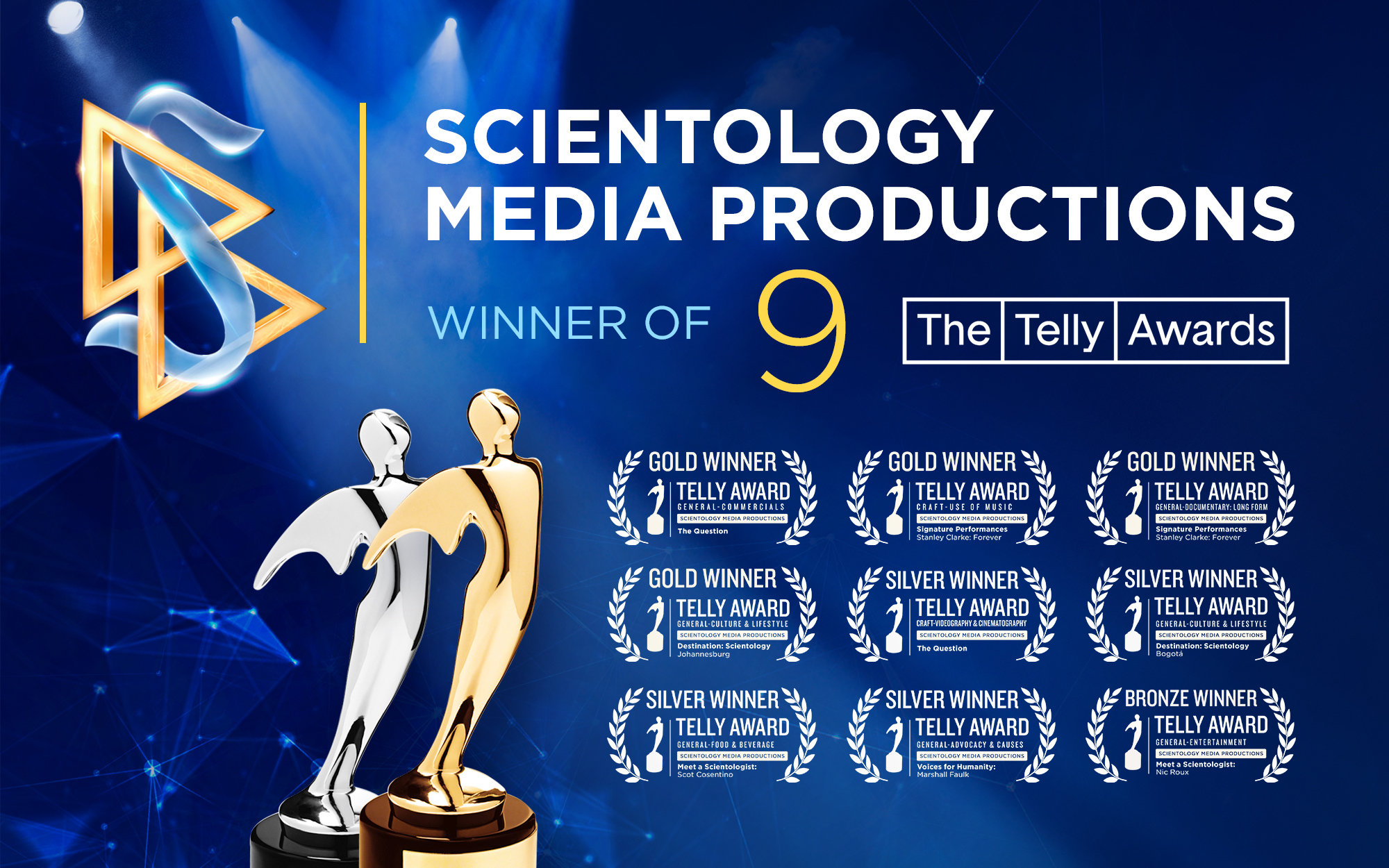 Scientology Media Productions was honored with nine awards at the 46th annual Telly Awards, including four Golds, marking over 50 Telly Awards earned since the launch of Scientology Network.