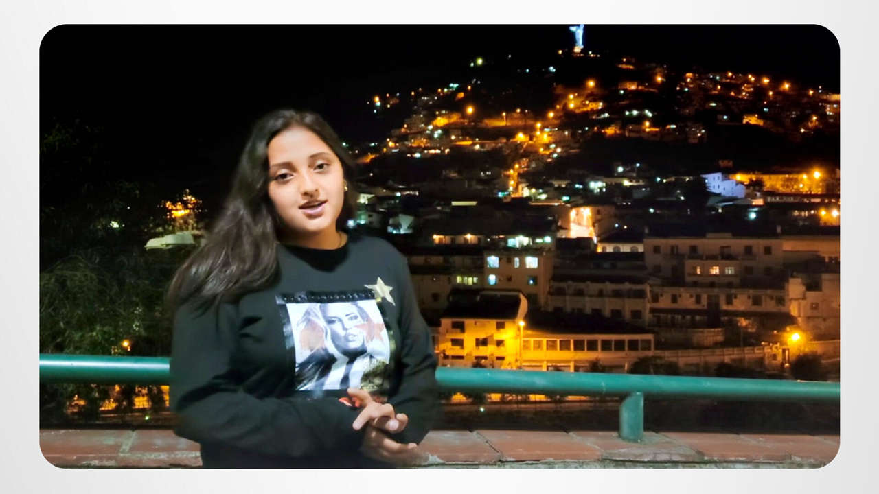 Anahí is rapping her way to The Way to Happiness, freestyling a “Flourish and Prosper” message. And her nighttime performance is set against the hillside topped with The Virgen del Panecillo, one of Quito’s landmark tourist spots. Yo, yo, listen up!
