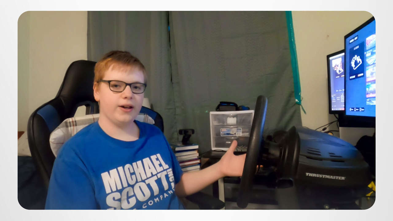 Logan goes for a wild ride … without ever leaving his room! He may be a tad shy of legal driving age, but that doesn’t stop him from experiencing the exhilaration of putting the pedal to the metal as he drifts and shifts into gear around hairpin turns—on his awesome driving-simulator setup!