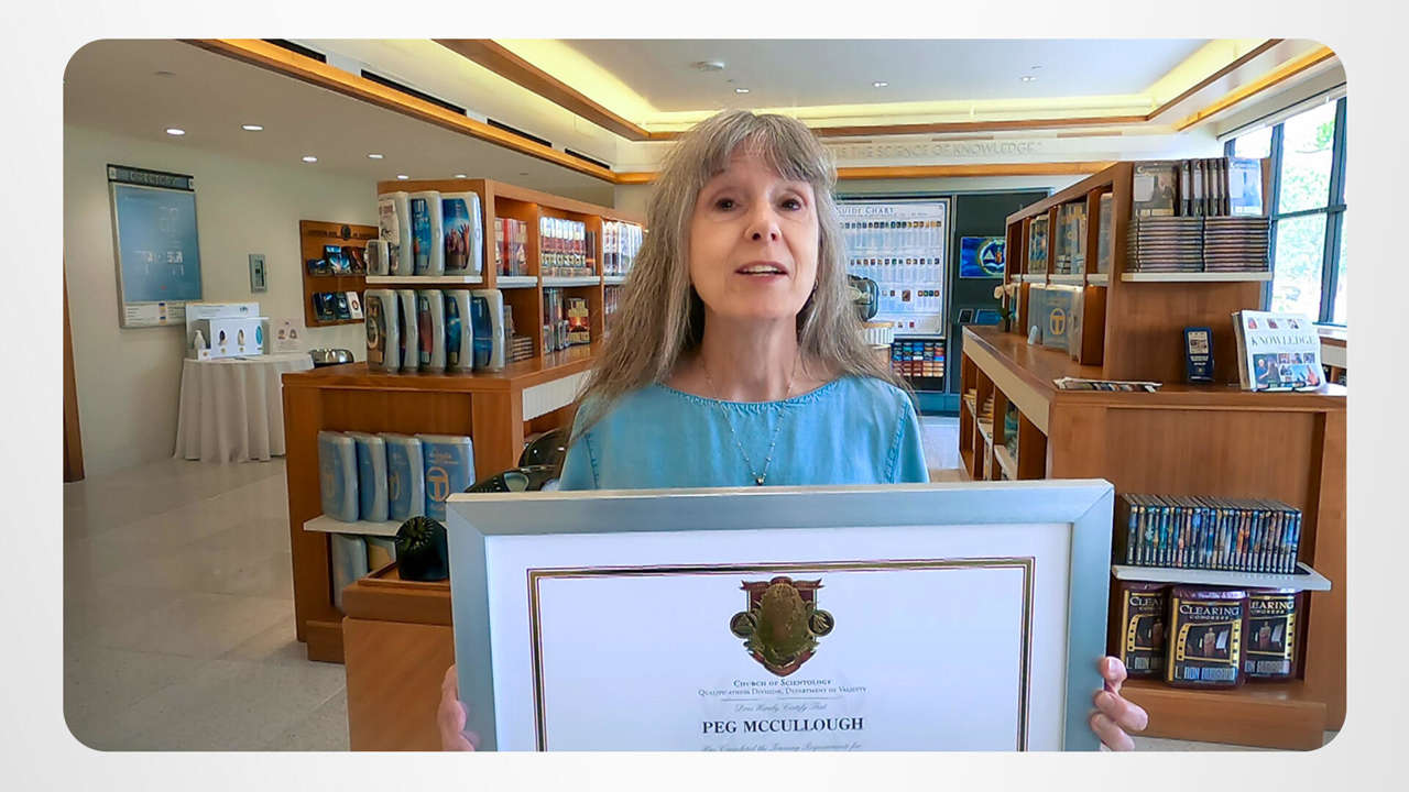 Peg just moved up a peg on the training side of the Scientology Bridge. And she’s so “jazzed” about being able to help others, she immediately started on her next course, moving another peg closer to the top of the Bridge.