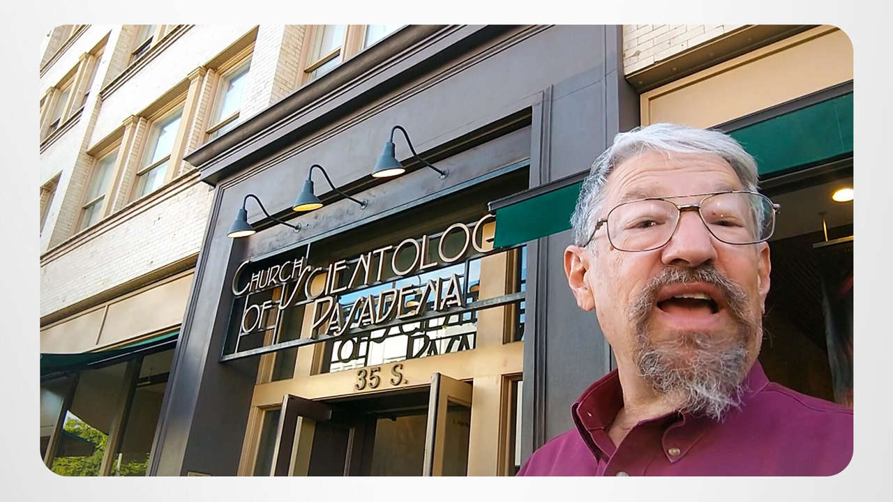 In Pasadena, the city famous for its annual Rose Parade, Ron is leading a one-man march to the Church of Scientology. He crosses the threshold of the historic building, passes through the indoor courtyard and right into the Golden Age of Knowledge course room!