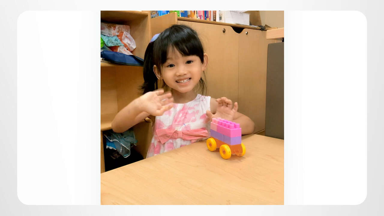 Three-year-old Yu-Tang is serious about playing. Her schedule is packed every day with play—building, drawing, coloring and more building. This girl’s a professional!